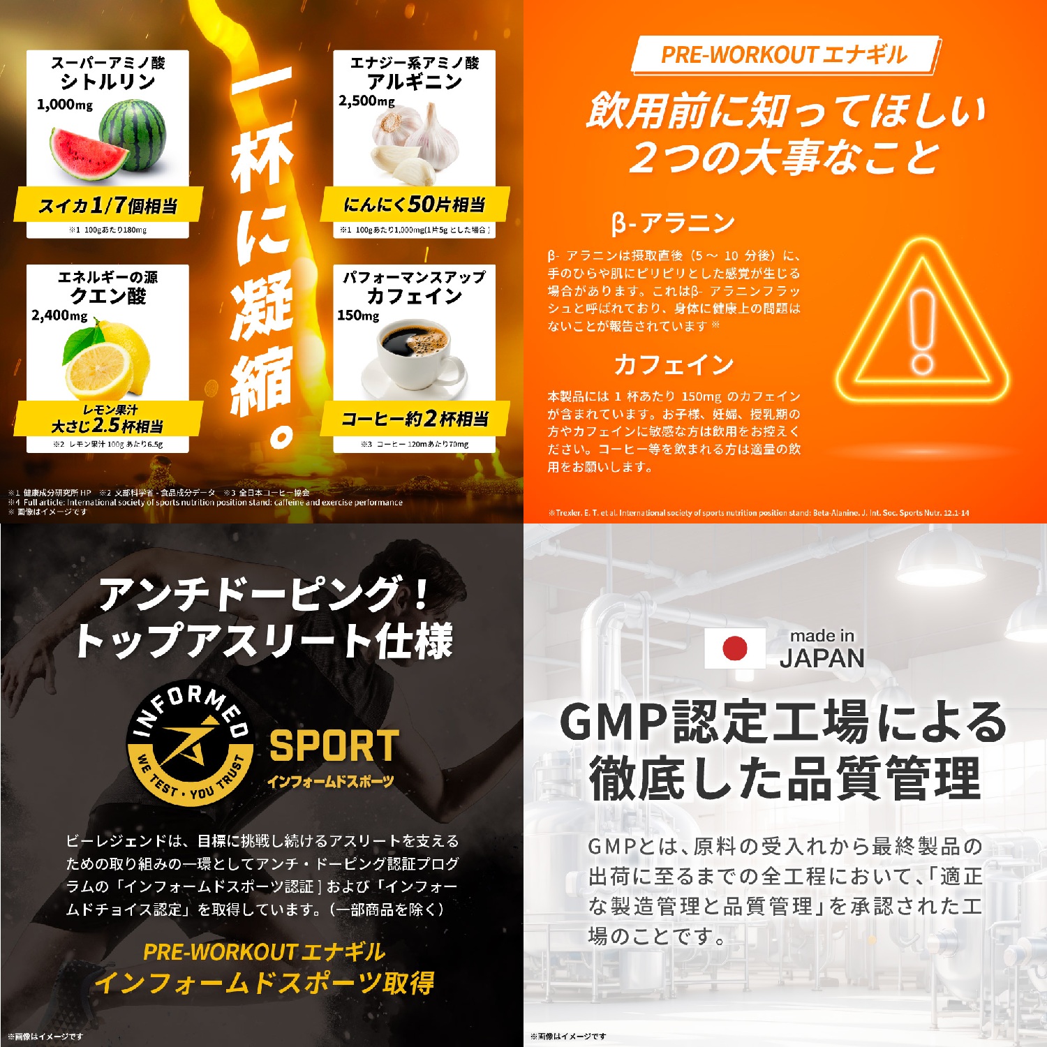 β-アラニン(国内製造)、L-シトルリン、還元麦芽糖水飴/L-アルギニン、クエン酸、甘味料(ステビア、アセスルファムカリウム、スクラロース)、カフェイン、クエン酸三ナトリウム、香料、クチナシ色素、微粒二酸化ケイ素、乳化剤(乳・大豆由来) |